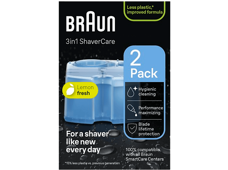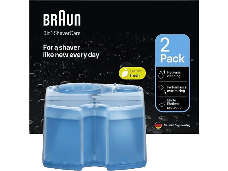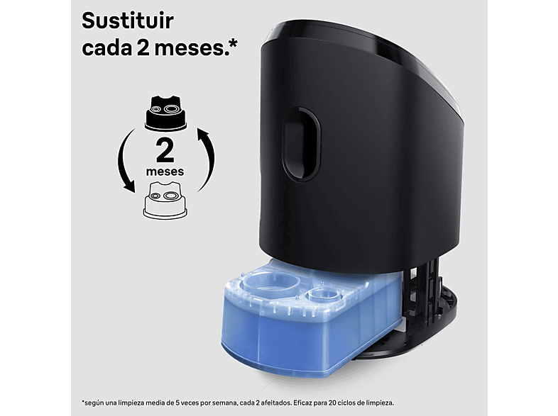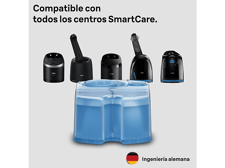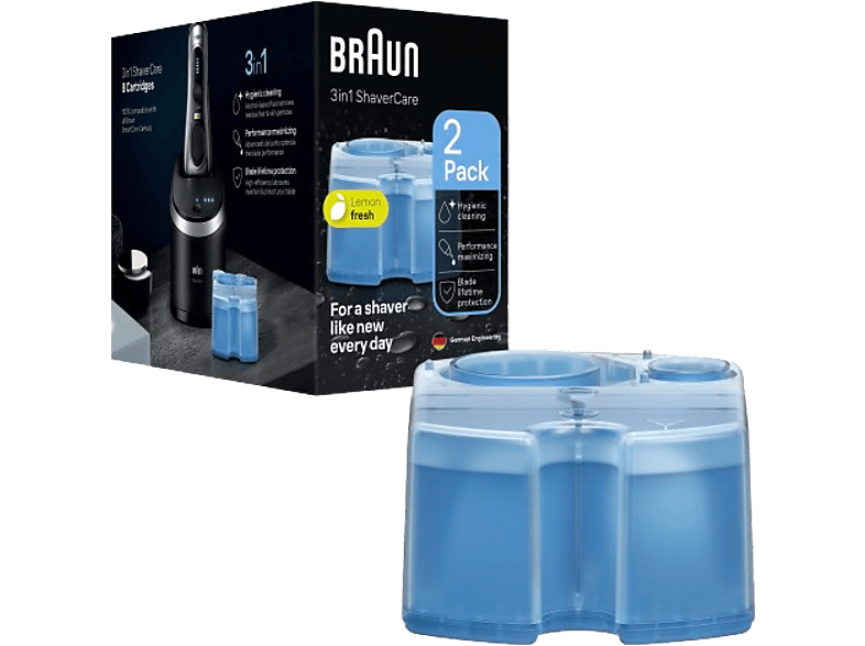 Para que tu maquinilla de afeitar eléctrica funcione como nueva cada día, sustituye el cartucho de recarga cada 2 meses (basado en una media de 5 limpiezas semanales, cada 2 afeitados; eficaz durante 20 ciclos de limpieza). Utiliza la solución de afeitado Braun después de cada afeitado. ShaverCare 3 en 1 es un producto original de Braun, diseñado en Alemania y totalmente compatible con cualquier centro de limpieza SmartCare de Braun.