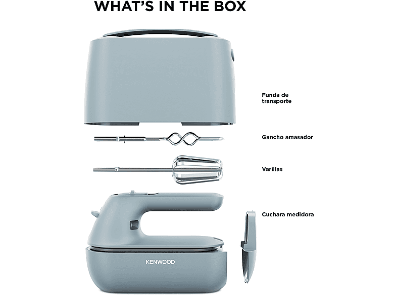 | Contenido | Batidora x 1, Asa de almacenamiento x 1, Varillas x 2, Ganchos de amasar x 2, Cuchara medidora x 1 |