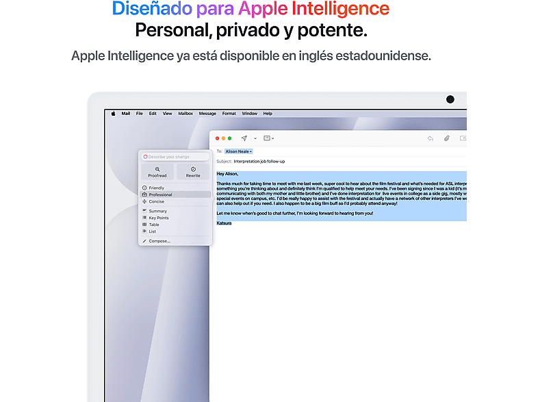 Apple Intelligence es un sistema de inteligencia personal que te ayuda a redactar, expresarte y hacer tus tareas diarias sin esfuerzo. Cuenta con revolucionarias prestaciones de privacidad para que nadie más pueda acceder a tus datos. Ni siquiera Apple.