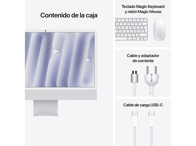 | Contenido | iMacTeclado Magic KeyboardRatón Magic MouseAdaptador de corriente de 143 WCable de corriente (2 m)Cable de carga USB‑C |