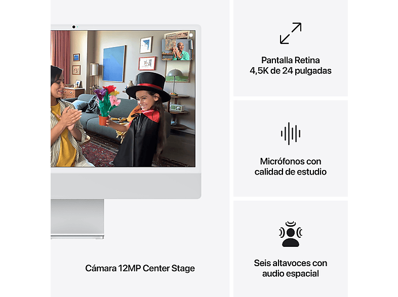 La impresionante pantalla Retina de 24 pulgadas del iMac te ofrece espacio de sobra para exprimir la multitarea, meterte de lleno en tus pelis y juegos y mucho más. Gracias a la resolución 4,5K y a los 500 nits de brillo verás imágenes nítidas y con todo lujo de detalles. El iMac también está disponible en una nueva opción de vidrio nanotexturizado, que reduce los brillos y reflejos para eliminar distracciones sin renunciar a la calidad visual.