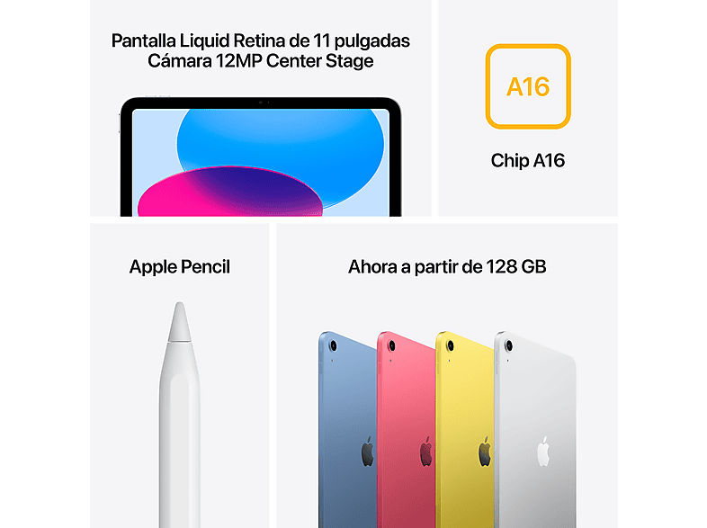 El iPad incluye una espectacular pantalla Liquid Retina con True Tone.* Entre la potencia del chip A16 y iPadOS, el iPad está pensado para ayudarte a crear, colaborar y disfrutar de todo lo que haces. Y los accesorios diseñados específicamente para el iPad suben aún más el listón.