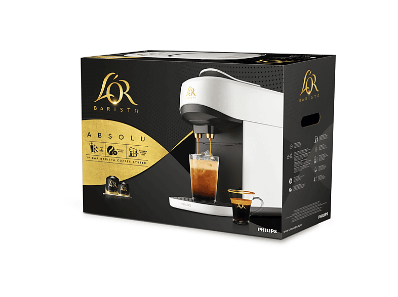 Cafetera de cápsulas L'OR BARISTA Absolu LM9512/00. Despierta tus sentidos con la nueva cafetera L'OR Barista Absolu. Disfruta de recetas de café caliente de confianza y descubre creaciones frías y refrescantes con la función Enjoy Over Ice. Su diseño elegante y adaptable, con un depósito de agua móvil, encaja a la perfección y con elegancia en cualquier cocina.