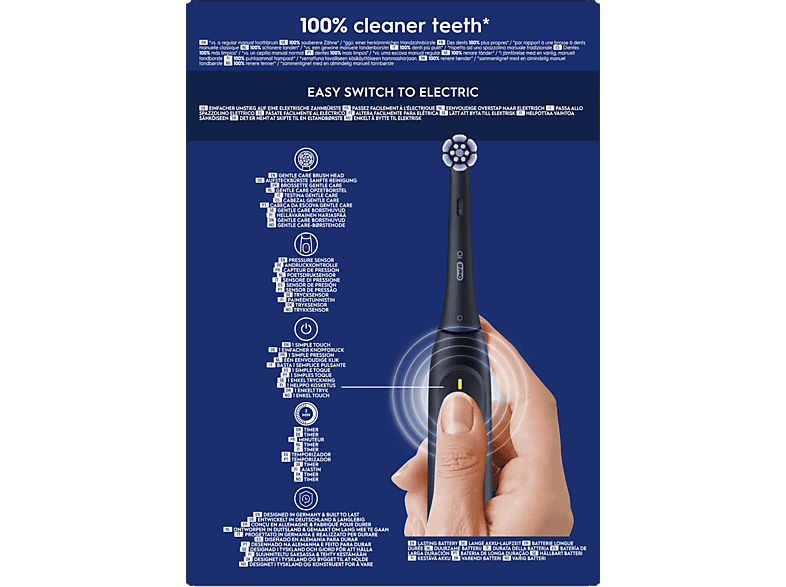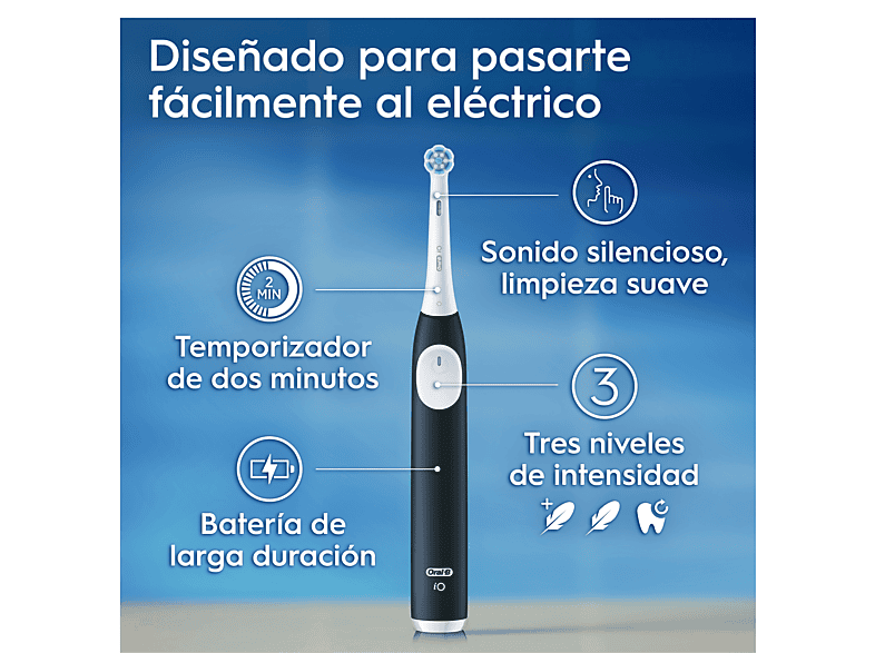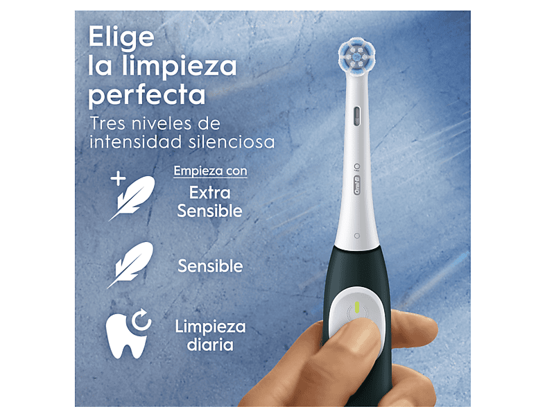 En comparación con un cepillo de dientes manual normal gracias a la revolucionaria tecnología iO de Oral-B: al combinar la oscilación-rotación del icónico cabezal del cepillo con microvibraciones ofrece una sensación de limpieza profesional y un cepillado suave.