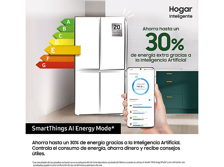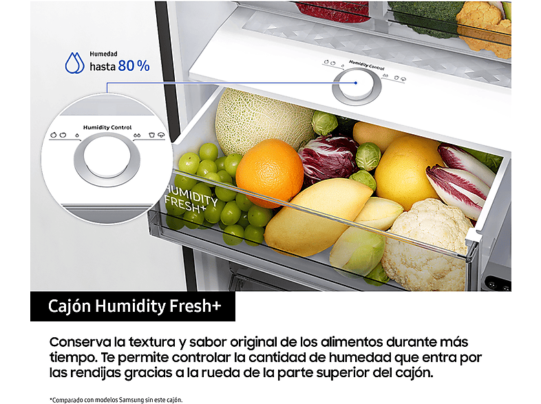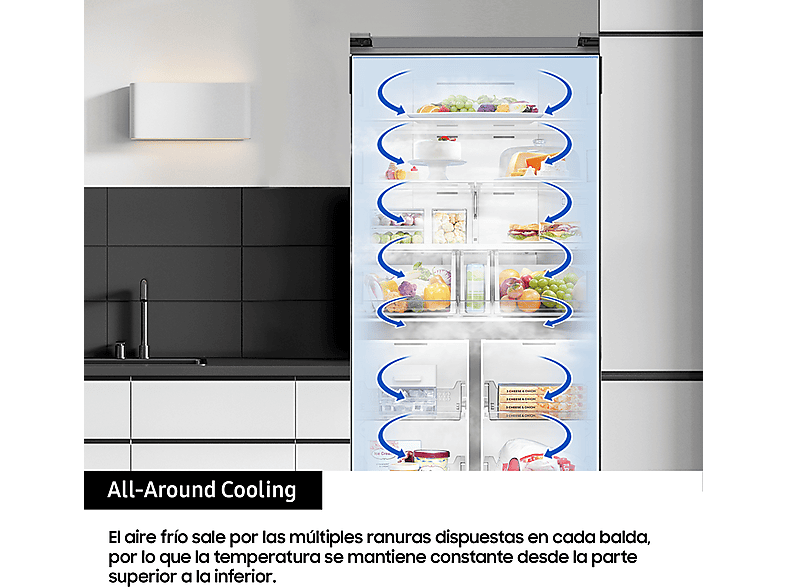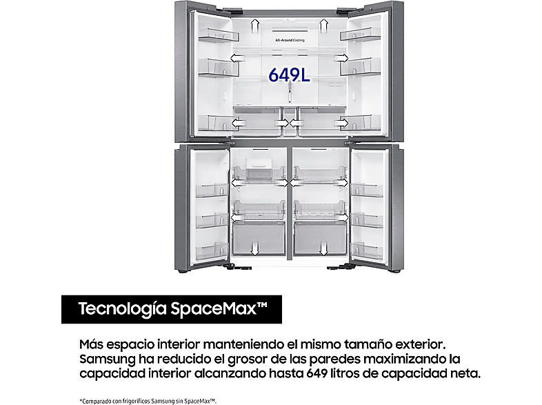 Samsung ha reducido el grosor de las paredes maximizando la capacidad interior alcanzando hasta 646 litros de capacidad bruta, de esta forma podrás almacenar más alimentos en su interior.La exclusiva tecnología SpaceMax™ utiliza un aislamiento especial que permite que las paredes sean mucho más finas sin comprometer la eficiencia energética.