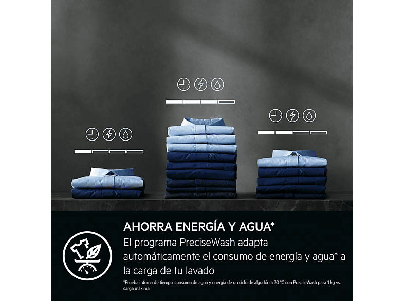 PreciseWash adapta automáticamente el consumo de energía y los ajustes en función del volumen de cada carga. De este modo obtienes ciclos de lavado personalizados que reducen el consumo de agua y energía y el tiempo de lavado hasta en un 40% al lavar cargas más pequeñas.