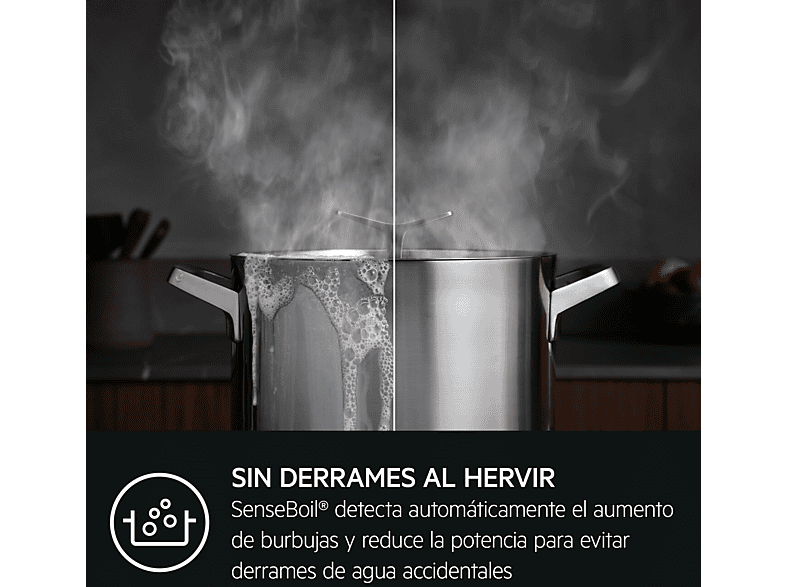 Deja que el sensor de ebullición de esta placa detecte cuando rompe a hervir el agua para reducir automáticamente la potencia a fuego lento. Se acabó tener que estar pendiente del agua.