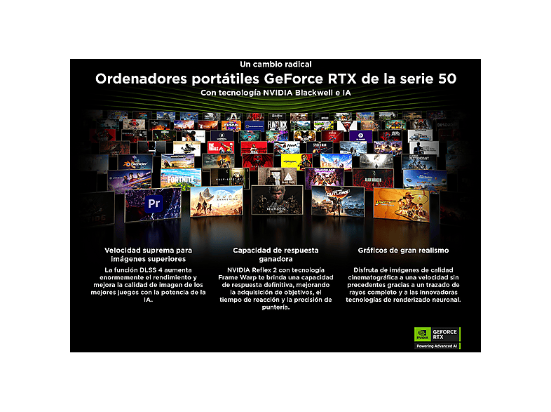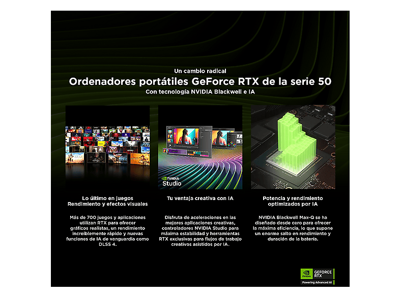 Con tecnología de NVIDIA Blackwell, las GPU GeForce RTX™ serie 50 ofrecen capacidades revolucionarias a jugadores y creadores. Equipada con una increíble potencia de IA, la RTX serie 50 abre el camino hacia nuevas experiencias y ofrece fidelidad gráfica de siguiente nivel. Multiplica el rendimiento con NVIDIA DLSS 4, genera imágenes a una velocidad sin precedentes y libera tu creatividad con NVIDIA Studio.