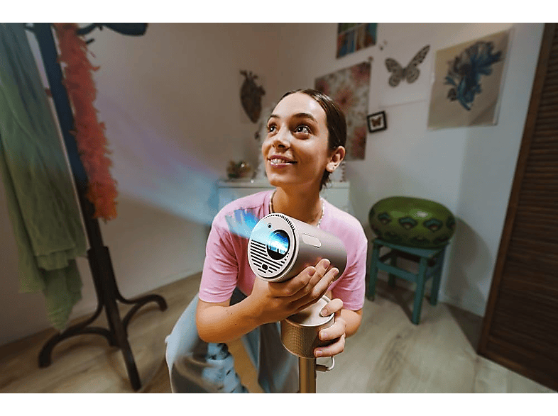 Con su forma cilíndrica, puedes girar fácilmente el MoGo 3 Pro sobre su base para mostrar imágenes Full HD HDR en cualquier superficie, desde el suelo hasta el techo, ya sea en línea recta o en ángulo. La imagen se alinea automáticamente gracias a la tecnología ISA 2.0, que garantiza que ningún obstáculo se interponga.