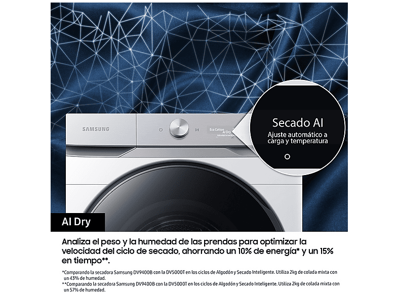 AI Dry: Analiza el peso y la humedad de las prendas para optimizar la velocidad del ciclo de secado, ahorrando un 10% de energía* y un 15% en tiempo.