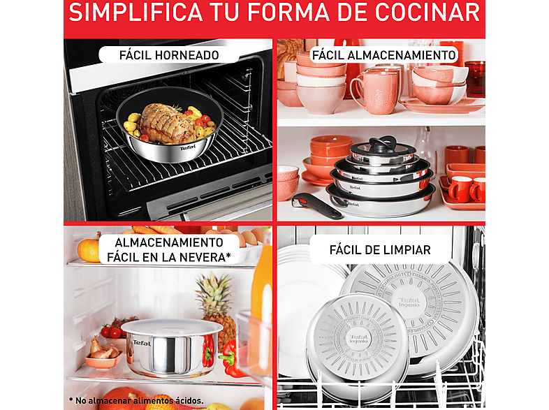 Con las sartenes y cazos Ingenio de mango extraíble, cocina, hornea, sirve y guarda en un solo recipiente, todo sin ensuciar y con total seguridad. ¡Simplifica tu vida en la cocina!