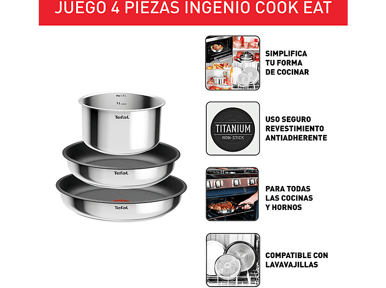 Set de sartenes - Tefal L881S4 Ingenio, 4 piezas, Mango extraíble, Revestimiento titanio antiadherente, Indicador de calor, Acero Inox