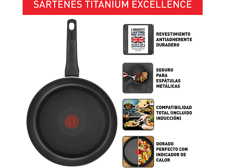 Descubre Titanium Excellence, la gama de sartenes de alta resistencia diseñada para enfrentarse a todos los retos de tu cocina. Su revestimiento antiadherente ultra duradero aguanta incluso el uso de espátulas metálicas, sin perder ni un ápice de seguridad para toda la familia.