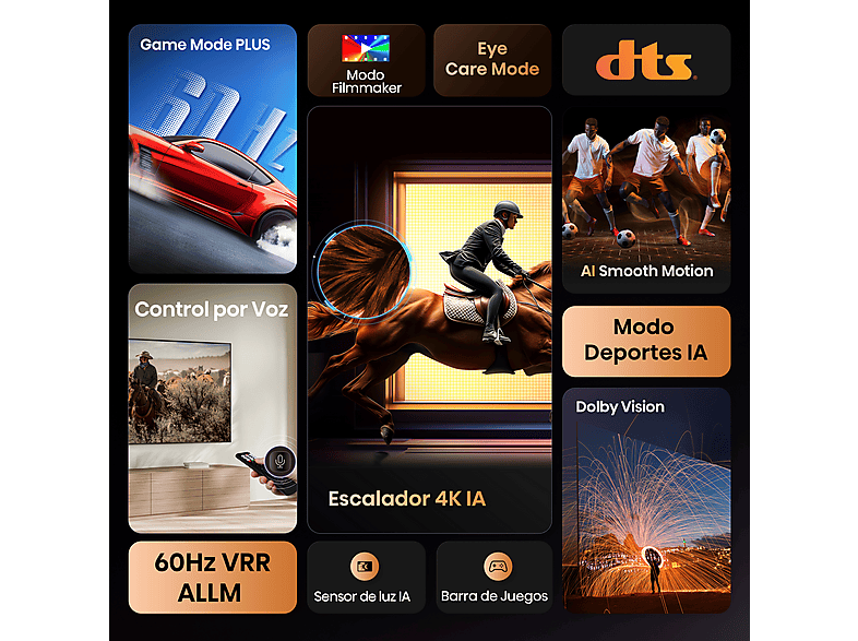 Gracias al IA 4K Upscaler, incluso los vídeos con menor resolución se optimizan para ofrecer una calidad de imagen más nítida y cercana al 4K real. Esta función analiza cada fotograma para mejorar los detalles y la claridad. Además, la tecnología IASmooth Motion reduce el desenfoque de movimiento con la ayuda del MEMC y la Reducción de Ruido 3D, ofreciendo escenas más fluidas en deportes, películas o videojuegos.