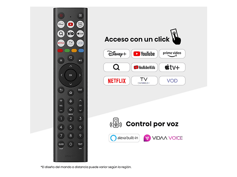 Disfruta de una experiencia conectada con VIDAA, un sistema operativo rápido, seguro y personalizable, que integra aplicaciones como Netflix, Prime Video, Disney+ o DAZN. El televisor incorpora Wi-Fi de doble banda, Bluetooth 5.0 y es compatible con el mando a distancia por voz de Hisense, permitiéndote cambiar de canal, ajustar el volumen o buscar contenido con simples comandos. Además, con Share to TV puedes compartir tu contenido desde el móvil al televisor con solo un clic.