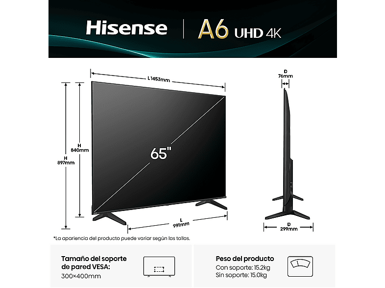 TV LED 65" - Hisense 65A6Q, UHD 4K, Quad Core/MT9603, IA 4K Upscaler, Modo Juego Plus, Control por voz, Negro