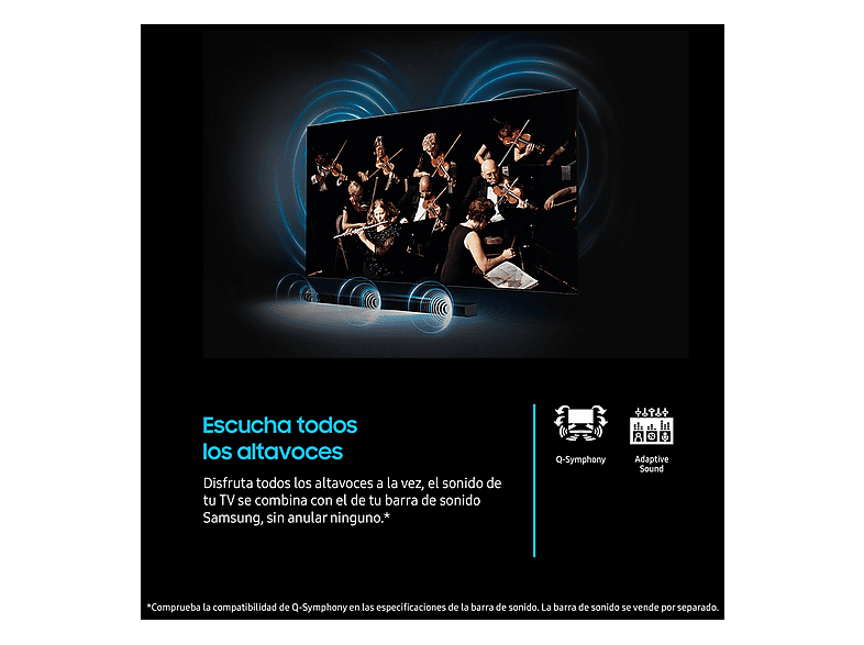 La tecnología 4K AI Upscaling escala tu contenido favorito como series, películas, deportes, y te asegura que lo veas en una resolución premium de 4K. Remata tu experiencia y hazla aún más envolvente con Q-Symphony, la tecnología que empareja el sonido del TV con el de tu barra de sonido.