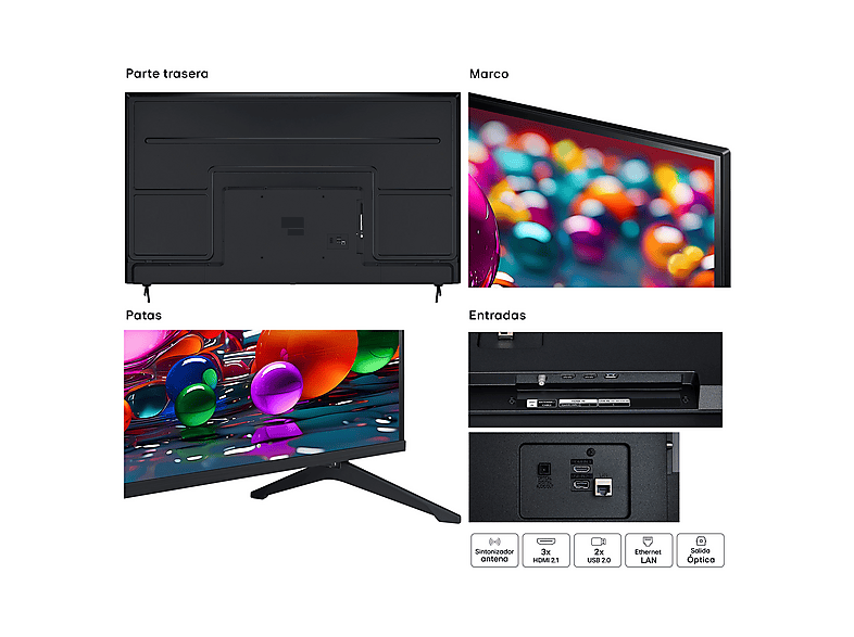 | Conexiones | 3x HDMI 2.0, 2x USB (v 2.0), Grabación Antena por USB (Requiere HDD 80GB-2TB), Sálida óptica |