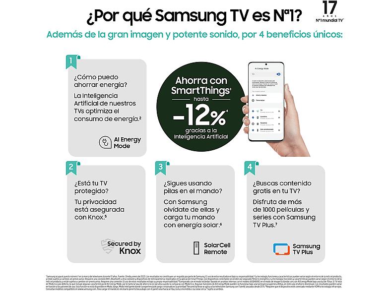 La experiencia completa con tu nuevo Smart TV de Samsung. Visualización de contenidos, juegos en la nube con Gaming Hub y control de todos tus dispositivos gracias a SmartThings.
