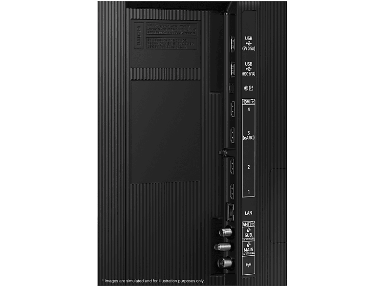 | Conexiones | DVB-T2CS2 x 2, HDMI 4, USB 2, Ethernet (LAN), Salida Audio Digital (Óptica), Entrada RF (Terrestre / Entrada Cable / Entrada Satellite) 1/1(Uso común para terrestre)/1, CI Slot, Canal Audio Retorno HDMI: eARC/ARC, WiFi, Bluetooth, Anynet+ (HDMI-CEC) |