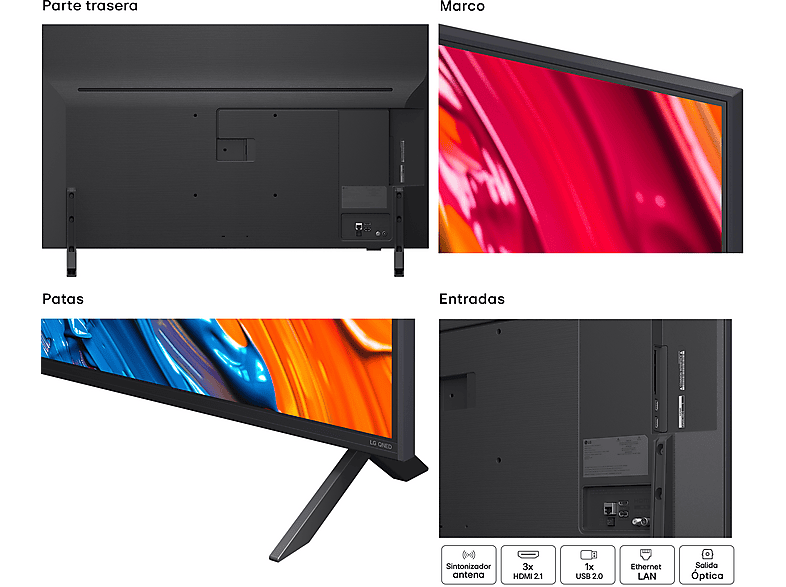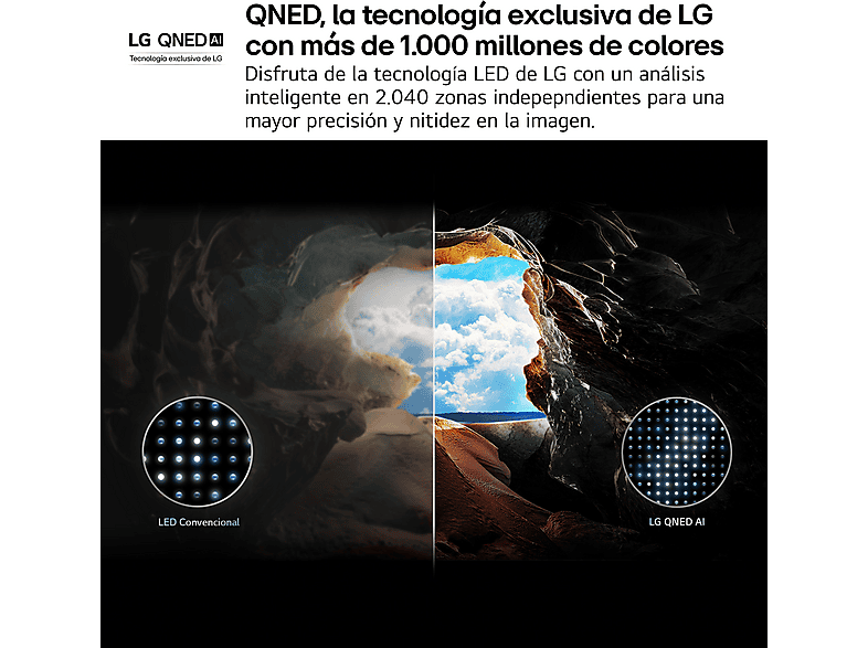 Más de 1.000 millones de colores, ahora más intensos que nunca con LG QNED, la tecnología exclusiva de LG. Mayor nitidez, contraste y brillo en la imagen, gracias al análisis inteligente de Dynamic Tone Mapping Pro en 2.040 zonas independientes y el control de la iluminación hasta 12 veces más preciso que ofrecen los MiniLEDs.