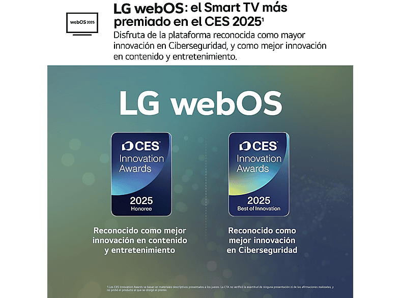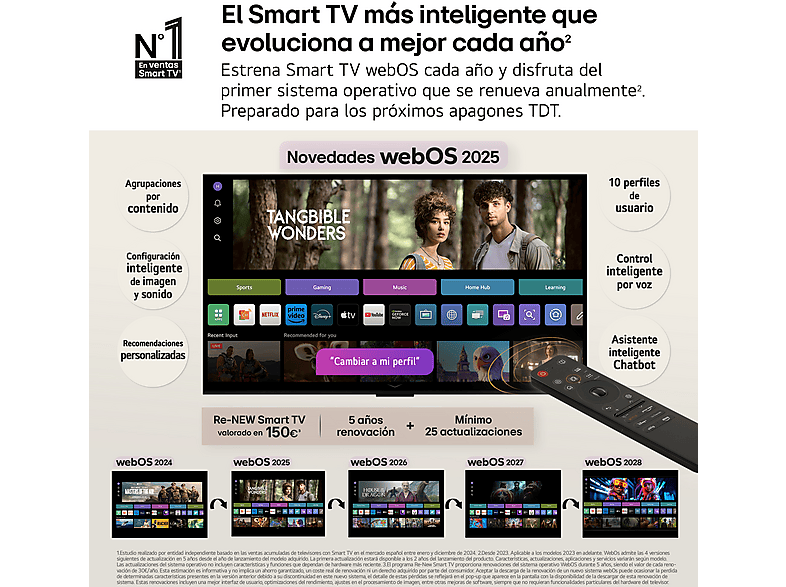 Smart TV webOS 25 que evoluciona a mejor cada año renovándose en tu TV e incorporando las nuevas funciones de la IA y que está preparado para próximos apagones TDT. Más inteligente para una personalización y un control del hogar avanzados: reconocimiento de voz, recomendación de contenidos, configuración de imagen y sonido, asistente virtual y mando Magic Remote con puntero inalámbrico.