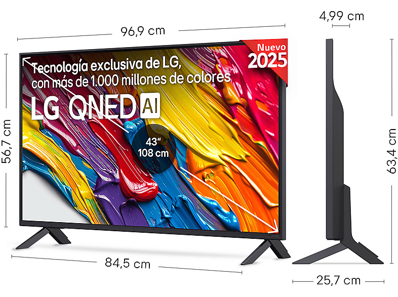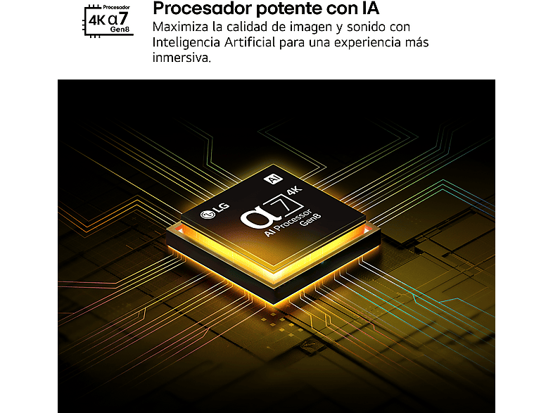 Descubre la TV QNED 43" LG 43QNED82A6B, con más de 1.000 millones de colores, ahora más intensos que nunca. Su procesador 4K α7 Gen8 optimiza imagen y sonido con IA, mientras que webOS 25 ofrece control por voz y personalización avanzada.